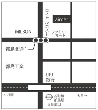 KIRINDO・大阪信用金庫方面にお進み頂きロイヤルホスト手前の道(都島北通交差点)を右に曲がるとすぐに、ファミリーマートがあります。その角を左に曲がると左手3軒目に【aimer】がございます。